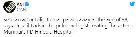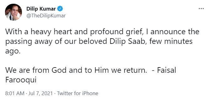 દિલીપકુમારના પારિવારિક મિત્ર ફૈઝલ ફારૂકીએ અભિનેતાના સત્તાવાર ટ્વિટર પરથી તેમના નિધનની માહિતી આપી છે. તેમણે લખ્યું હતું, ખુબ ભારે દિલથી કહેવું પડે કે હવે દિલીપ સાબ હવે અમારી સાથે નથી’” આ સમાચાર મળતા જ ઈન્ડસ્ટ્રીમાં શોકની લહેર ફરી વળી છે. તમામ સેલેબ્સથી લઈને ચાહકો સુધી દરેક તેના નિધન પર દુઃખ વ્યક્ત કરી રહ્યા છે.