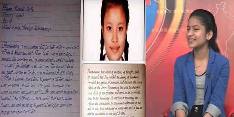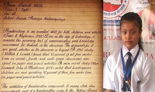 નેપાળમાં રહેતી પ્રકૃતિ મલ્લા નામની છોકરીની હસ્તલેખન જોઈને લાગે છે કે આ છોકરીએ પોતાના હાથથી લખી નથી અને કોમ્પ્યુટરમાંથી લખીને એનું છાપું કાઢી છે. પ્રકૃતિ હજી આઠમા ધોરણની વિદ્યાર્થી છે. તે નેપાળની સૈનિક રહેણાંક કોલેજમાં અભ્યાસ કરે છે. તેની હસ્તાક્ષર જોઈને વડીલોને પરસેવો થાય છે.