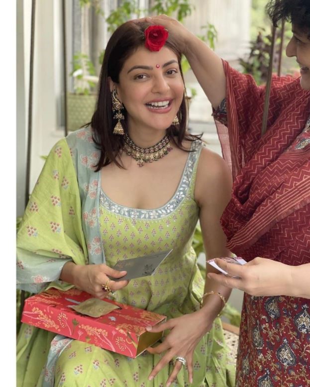 કાજલે પોશાકની સાથે તેના કપાળ પર ગુલાબની બનેલી ટીકા પણ રાખી છે. તસવીરોમાં તેની માતા તેના ગળામાં સુંદર હાર પહેરાવતી જોવા મળે છે.