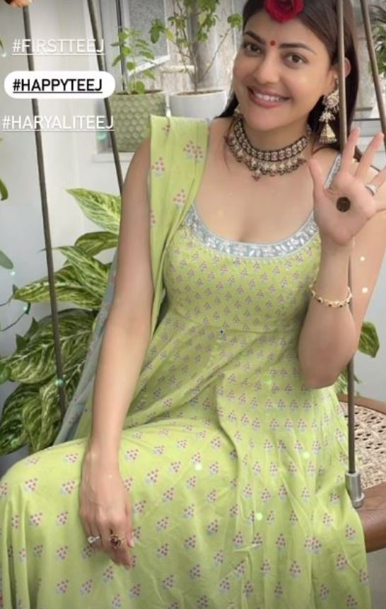તમને જણાવી દઈએ કે કાજલે પોતાના ઈન્સ્ટાગ્રામ ગ્રામ પર તીજની ઉજવણી કરતા ફોટા પોસ્ટ કર્યા છે. આ ફોટામાં તે લીલા અનારકલી સૂટમાં જોવા મળી રહી છે. જો કે, સૂટ પર હળવા વાદળી બોર્ડર પણ છે જે તેને વધુ સુંદર બનાવે છે. બીજી તરફ, ઝૂલા પર બેઠેલી કાજલ ના હાથમાં મહેંદીનો ટીકો જોવા મળે છે.