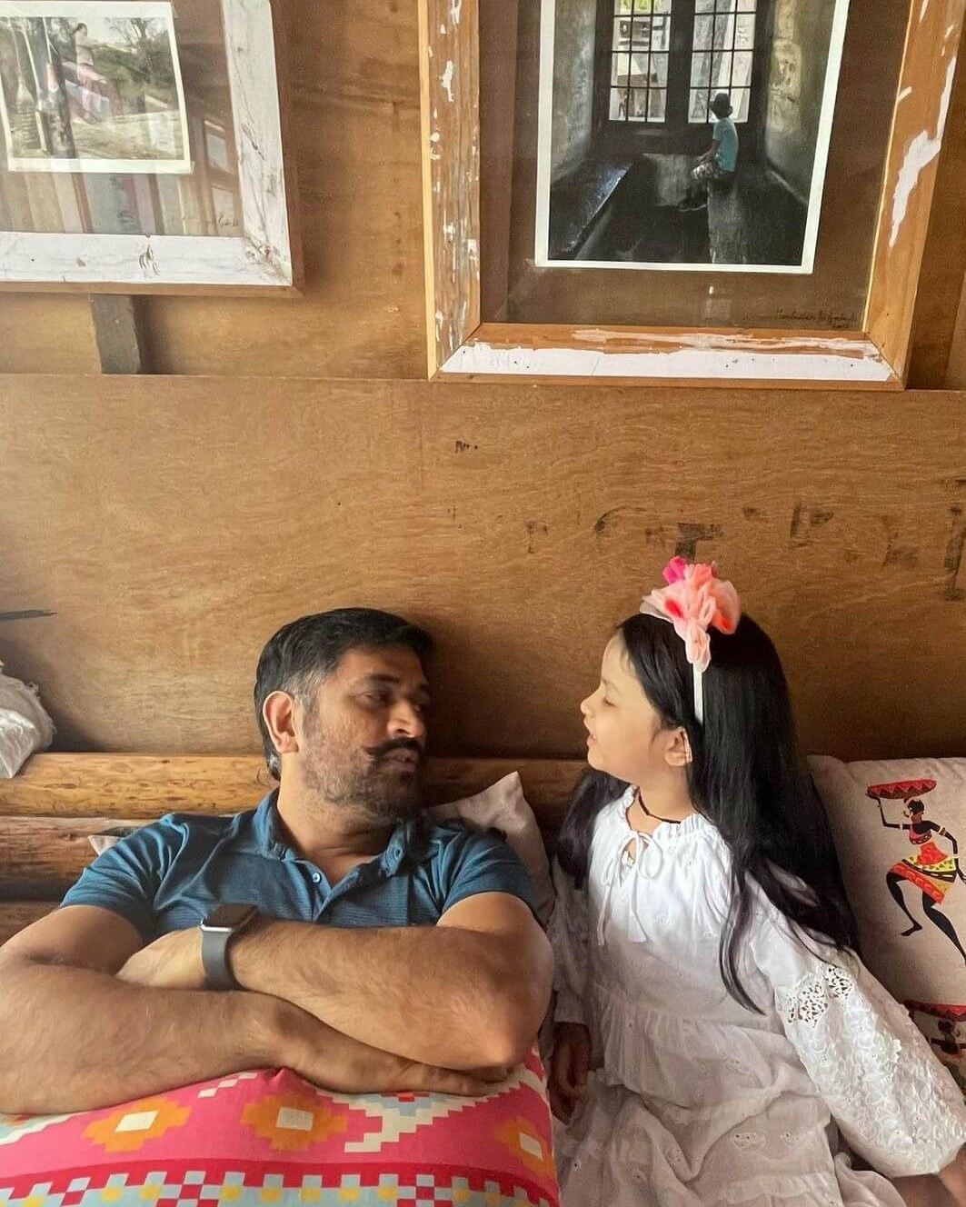 આ તસવીરમાં જીવા તેના પિતા સાથે વાત કરતી જોવા મળી રહી છે. પણ આ શું છે. એક તરફ, જ્યાં પિતા સાથે ઘણી વાત કરવી છે, તો બીજી બાજુ ધોની ઊંઘમાં જોવા મળે છે.