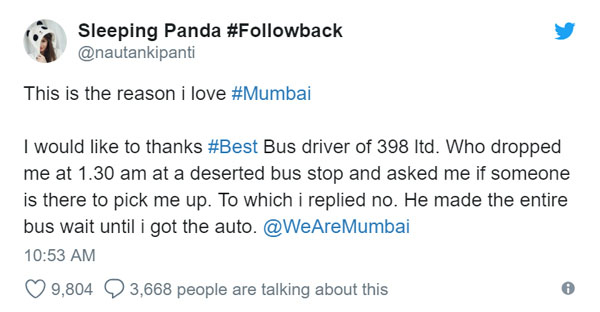 સામાન્ય રીતે બસ વાળો છોકરીને છોડીને ત્યાંથી જઇ શકતા હતા કારણ કે તેમની ફરજમાં આ બધું શામેલ નથી, પરંતુ એક માનવી તરીકે જ્યાં સુધી તેણીને ઓટો ન મળે ત્યાં સુધી તેઓએ તેને એકલી છોડી ન હતી. આ ઘટના પછી, છોકરીએ nautankipanti ટ્વિટર હેન્ડલ પરથી બેસ્ટ બસ 398 ના ડ્રાઇવર અને કંડક્ટરની પ્રશંસા કરી અને લખ્યું,