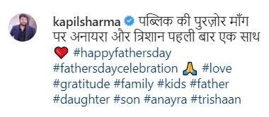 કપિલ શર્મા અને ગિન્નીએ 1 ફેબ્રુઆરી 2021 ના રોજ તેમના દીકરાનું સ્વાગત કર્યું હતું અને કપિલે પુત્રના જન્મની ખુશખબર એક પોસ્ટ શેર કરીને ચાહકોને શેર કરી હતી, પરંતુ તે સમયે કપિલે તેમના પુત્રની કોઈ પણ તસવીર ચાહકો સાથે શેર કરી હતી. પરંતુ હવે કપિલના પુત્ર ત્રિશાનની પહેલી તસવીર સામે આવી છે અને કપિલે ફાધર્સ ડેના ખૂબ જ ખાસ પ્રસંગે તેની પુત્રી અનૈરા અને ત્રિશાન સાથે ખૂબ જ સુંદર પોસ્ટ શેર કરી છે.