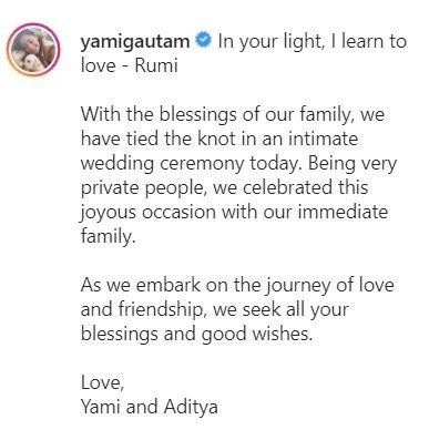 ખૂબ ખાનગી લોકો હોવાને કારણે, અમે અમારા પરિવાર સાથે આ ખુશ પ્રસંગની ઉજવણી કરી. અમે હવે પ્રેમ અને મિત્રતાની યાત્રા શરૂ કરી છે. અમને તમારા આશીર્વાદ અને શુભેચ્છાઓ માંગીએ છીએ. લવ, યામી અને આદિત્ય.
