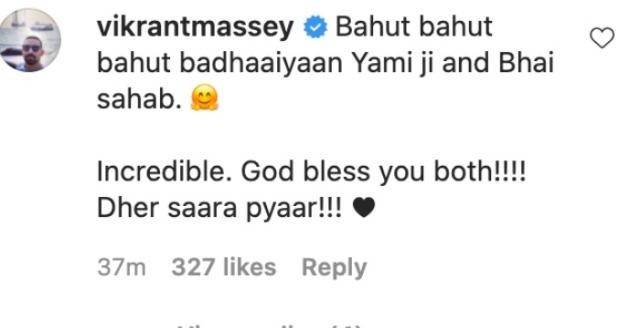 લગ્નની તસવીર સામે આવતાની સાથે જ બોલીવુડ સાથે સંકળાયેલી હસ્તીઓ તરફથી યામી અને આદિત્યને અભિનંદન આવ્યા. અભિનેતા વિક્રાંત મેસીએ લખ્યું, ‘યામી જી અને ભાઈને ઘણી બધી અભિનંદન. માન્યતા બહાર. ભગવાન તમને બંને ને આશીર્વાદ આપે, ઘણો બધો પ્રેમ! ‘દિયા મિર્ઝાએ પણ શુભેચ્છાઓ શેર કરી અને લખ્યું,’ અભિનંદન યામી અને આદિત્ય. આગળની અદ્ભુત યાત્રા માટે ઘણો બધો પ્રેમ અને શુભેચ્છાઓ! ‘