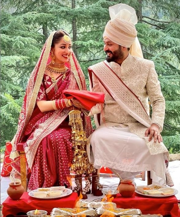 તેના લગ્નમાં યામી ગૌતમે લેહેંગાને બદલે લાલ રંગની સાડી પસંદ કરી હતી, જેના પર તેણીએ લાલ દુપટ્ટા લગાવ્યો હતો. પોતાન લુકને પૂર્ણ કરવા માટે યામી ગૌતમે લાંબી નેક ચેન, મેચિંગ ઇયરિંગ્સ અને માંગ ટીકા સાથે હેવી ચોકર પહેરેલ છે. જેમાં યામી ખૂબ જ સુંદર લાગી રહી છે. તે જ સમયે, આદિત્ય ક્રીમ રંગની શેરવાનીમાં ખૂબ જ સુંદર દેખાઈ રહ્યા છે.