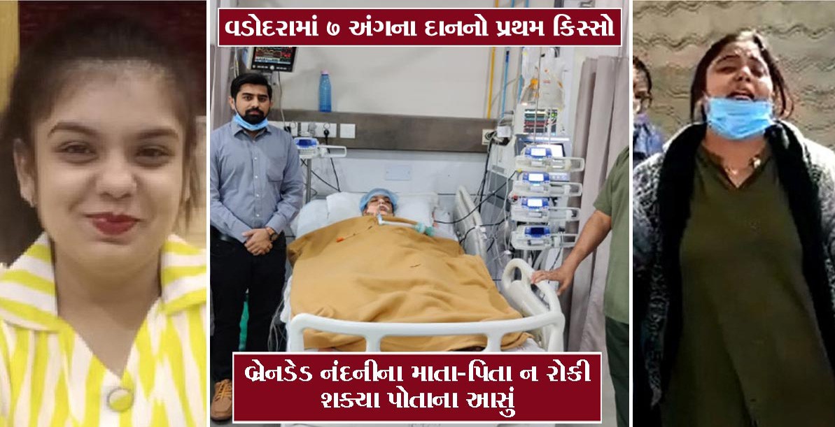 ગુજરાતના વડોદરાની સવિતા હોસ્પિટલમાં સારવાર સમયે હાલોલની કિશોરીને બ્રેનડેડ જાહેર કરવામાં આવી હતી. ત્યારે પરિવારજનો પર આભ તુટી પડ્યું હતું. જોકે આ કિશોરીના 7 અંગના દાન કરવામાં આવ્યા છે જેમાં હાર્ટ, ફેફસા, બે કિડની, બે ચક્ષુ અને લિવરનું દાન કરવામાં આવ્યું છે. એકસાથે 7 અંગોનું દાન કરવામાં આવ્યા તેવો વડોદરાનો આ પહેલો કિસ્સો છે. નંદનીનાં અંગોને હોસ્પિટલમાંથી લઈ જવામાં આવતાં હતાં ત્યારે તેના માતા-પિતા પોતાનાં આંસુ રોકી શક્યાં ન હતાં અને ધ્રૂસકે-ધ્રૂસકે રડવા લાગ્યા હતા ત્યારે હોસ્પિટલમાં સન્નાટો છવાઈ ગયો હતો.