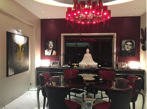 ડાઇનિંગ એરિયામાં પણ નરગિસ અને સુનીલ દત્તની એક અનોખી તસવીર દિવાલ પર છે. સફેદ પત્થરની બુદ્ધ પ્રતિમા અને લાલ રંગનું ઝુમ્મર તેના ઘરને સર્વોપરી દેખાવ આપે છે.