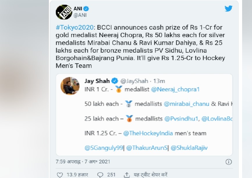 તમને જણાવી દઈએ કે ભારતીય ક્રિકેટ કંટ્રોલ બોર્ડે નીરજને ઈનામ તરીકે એક કરોડ રૂપિયા આપવાની પણ જાહેરાત કરી છે. આ ઉપરાંત BCCI ટોક્યોમાં મેડલ જીતનાર અન્ય ભારતીય રમતવીરોને પણ પુરસ્કાર આપશે. બોર્ડે સિલ્વર મેડલ વિજેતા મીરાબાઈ ચાનુ અને રવિ દહિયાને 50-50 લાખનું અનુદાન આપવાની જાહેરાત કરી છે.