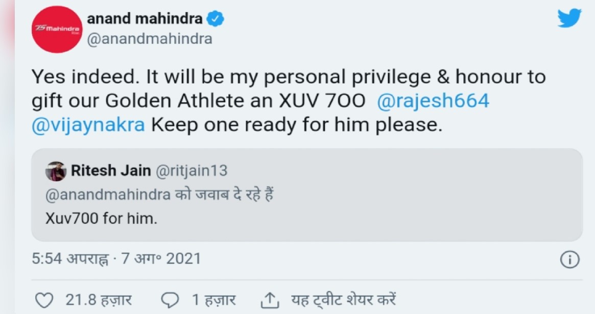 નીરજ ચોપરાએ મેડલ જીત્યાના થોડા જ કલાકો બાદ મહિન્દ્રાએ આ જાહેરાત કરી હતી. હકીકતમાં ટ્વિટર પર તેના એક ફૉલોઅરે મહિન્દ્રાને નીરજ ચોપરાને XUV700 ભેટ આપવા કહ્યું. જેને આનંદ મહિન્દ્રાએ લખ્યું, ‘હા બિલકુલ! અમારા ગોલ્ડન એથ્લીટને XUV700 ની ભેટ આપવી એ મારો લહાવો અને સન્માન હશે.’