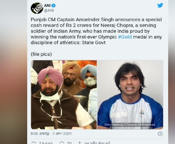 પંજાબના મુખ્યમંત્રી કેપ્ટન અમરિંદર સિંહ પણ નીરજની સુવર્ણ સફળતાથી ખૂબ જ ખુશ હતા અને તેમણે પોતાની જીતની ઉજવણી પણ કરી હતી. તેમના મતે, નીરજનું પંજાબ સાથે ઊડું જોડાણ છે અને સમગ્ર પંજાબને તેના પર ગોલ્ડ મેડલ જીતીને ગર્વ છે. સીએમ અમરિંદર સિંહે નીરજને 2 કરોડ રૂપિયાના પુરસ્કારની જાહેરાત કરી હતી.
