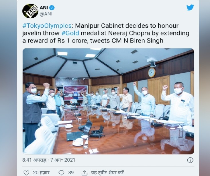 નીરજે ટોક્યો ઓલિમ્પિકમાં જેવેલિન થ્રો ઇવેન્ટમાં ગોલ્ડ મેડલ જીત્યા બાદ મણિપુર સરકારે તેને 1 કરોડ રૂપિયા આપવાની જાહેરાત કરી હતી. નીરજને ઈનામ તરીકે એક કરોડ રૂપિયા આપવામાં આવશે, આ નિર્ણય કેબિનેટની બેઠકમાં લેવામાં આવ્યો હતો.