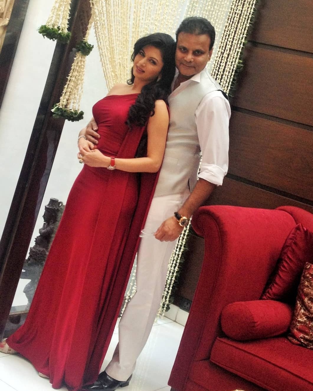 લાંબી જગ્યા ધરાવતા લિવિંગ રૂમમાં મોંઘા અને મખમલી સોફા લગાવવામાં આવ્યા છે. લિવિંગ રૂમના એક ભાગમાં લાલ સોફા મુકવામાં આવ્યા છે.
