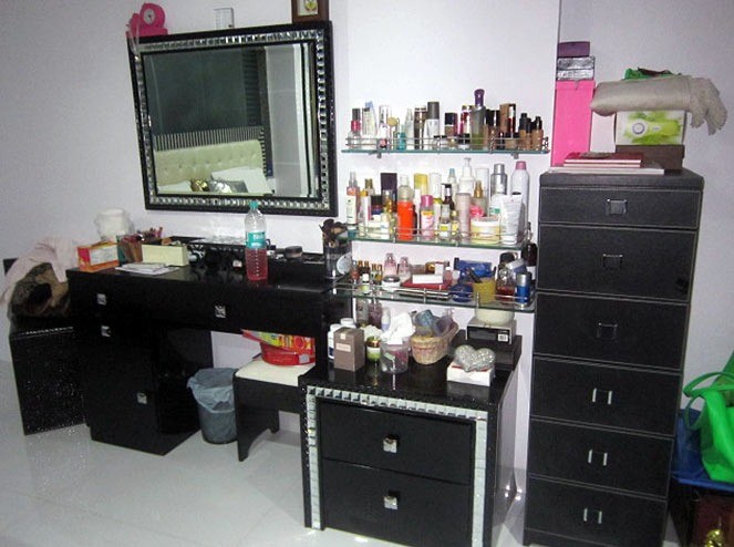 સનાના મેકઅપ રૂમની વાત કરીએ તો તે પણ બ્લેક થીમ પર બનાવવામાં આવી છે. સનાના ડ્રેસિંગ એરિયાની અલમારી કાળી છે. તમે આ ફોટામાં જોઈ શકો છો. ઘણી મેકઅપ વસ્તુઓ અહીં રાખવામાં આવી છે.